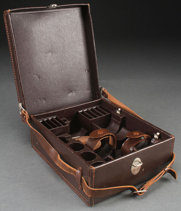 A LEITZ LEICA LEATHER COMBINATION CASE, MID 20TH CENTURY. With fitted and divided interior. 9.5 inches x 7.75 inches x 3 inches (24 x 19.5 x 7.5 cm).