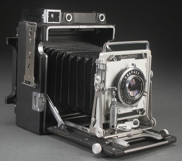 A GRAFLEX 4x5 CROWN GRAPHIC CAMERA, MID 20TH CENTURY. With range finder, 135mm f4.7 Optar lens and a 152mm f4.5 Ektar lens.
