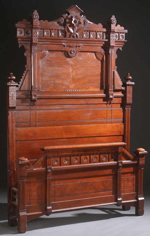 A TWO PIECE VICTORIAN WALNUT BEDROOM SET, CIRCA 1875. Consisting of a two drawer, deep well dresser flanked with two double drawer hanky boxes below a paneled frame mirror, with carved rosettes, with matching double size bedstead, together with a provincial walnut Victorian full-sized bed. Height (dresser) 85 inches (216 cm), height of bed 89 inches (226 cm).