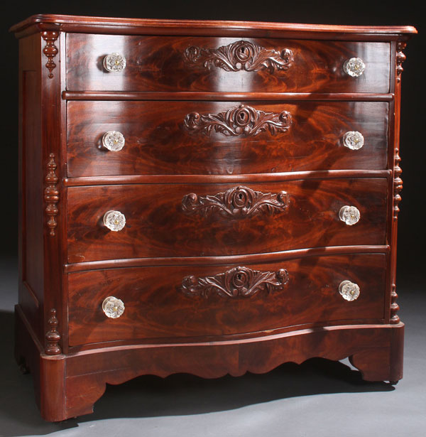 AN EMPIRE MAHOGANY CHEST, 19TH CENTURY. Four drawer with flame mahogany fronts and embossed sandwich glass pulls. 41 x 42 x 22 inches (104 x 107 x 56 cm).