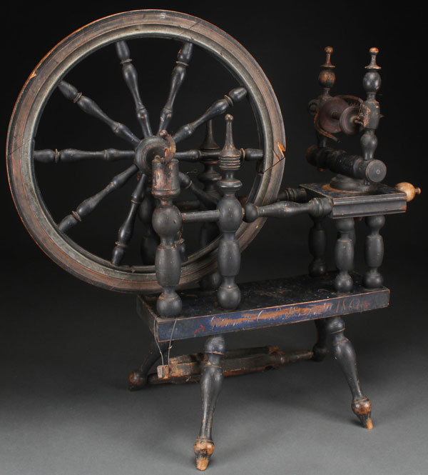 A NORWEGIAN POLYCHROME MAPLE SPINNING WHEEL, DATED 1802. The finely turned spindles on matching stand and under a midnight blue milk paint with polychrome date 1802 and indistinguishable owner's name. Height 33.5 inches (85 cm), length 36 inches (91.5 cm).