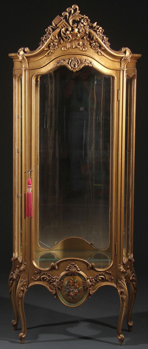 AN ITALIANATE GILT WOOD ETAGERE, MID 20TH CENTURY. With carved wood foliate crest above a bow front curved glass door, and flanking serpentine glass sidelights. Height 71.75 inches (182.2 cm).