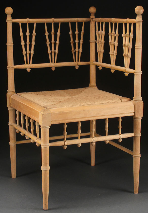 A VICTORIAN SPOOL TURNED MAPLE CORNER CHAIR. With woven rattan seat, the surface unfinished. Height 30 inches (76 cm).