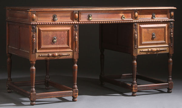 A KITTINGER WALNUT KNEEHOLE DESK, EARLY 20TH CENTURY. With Burl wood panels raised on turned legs. Width 55 inches (139.5 cm), depth 27.5 inches (70 cm).