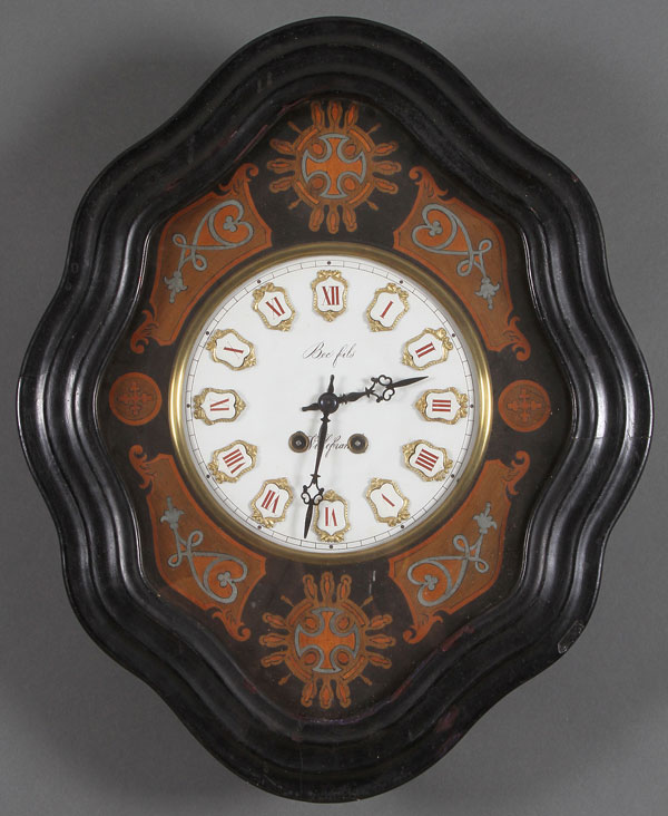 A FINE FRENCH INLAID PICTURE FRAME CLOCK, 19TH CENTURY. The scalloped frame enclosing a marquetry clock face with enameled dial and numerals in gilt cartouches. Inscribed "BEC FILS VILLE FRANCE". Height 24.25 inches (61.5 cm).