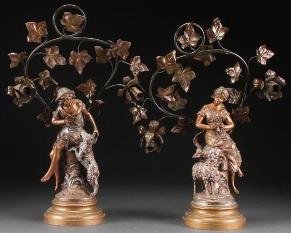 A PAIR OF VICTORIAN FIGURAL LAMPS AFTER MOREAU. Each modeled as shepherds with scrolled feet and vine. Two lamp fixtures. Height 26 inches (66 cm).