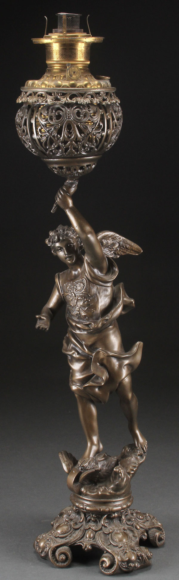 A VICTORIAN FIGURAL KEROSENE NEWEL POST LAMP. Modeled as a guardian angel, supporting a reticulated font holder under a bronze colored finish. Some repairs. Height 34 inches (86.5 cm).