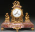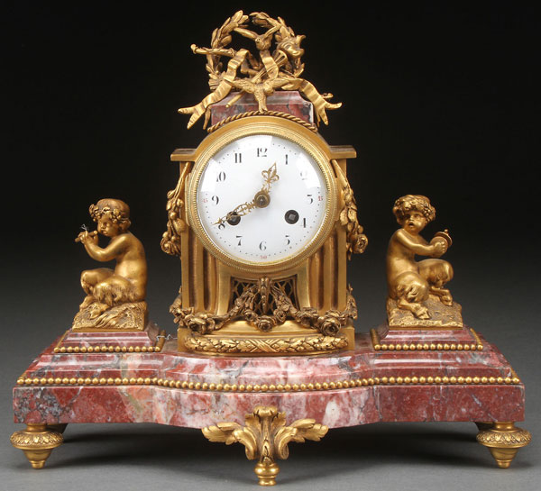 A FINE FRENCH LOUIS XVI STYLE GILT BRONZE AND MARBLE CLOCK, CIRCA 1900. The central clock with floral swag mounts below a finial with wreath, quiver, bow, and torch. Flanked by figures of pan playing musical instruments. The movement stamped "Eight jewels made in France." Length 12 inches (30.5cm).