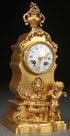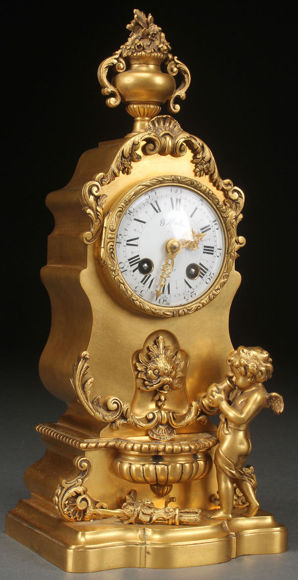 A FRENCH LOUIS XVI STYLE GILT BRONZE FIGURAL DESK CLOCK, CIRCA 1900. Depicting Cupid drinking at a fountain. The porcelain dial inscribed "G. Fabre Paris." The movement stamped "Deux-Paris" and "Eleven Jewels." Height 12.25 inches (31cm).