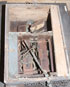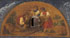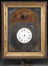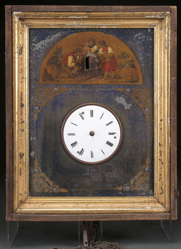 A CONTINENTAL JAPANNED TIN CUCKOO CLOCK, EARLY TO MID 19TH CENTURY. With porcelain dial sans hands, below a scenic arched painting of children surrounding tree stump, with hinged door for cuckoo, contained in a picture frame with gilt liner, various loses and disrepair, in "As Found" condition. Height 18 inches (46 cm).