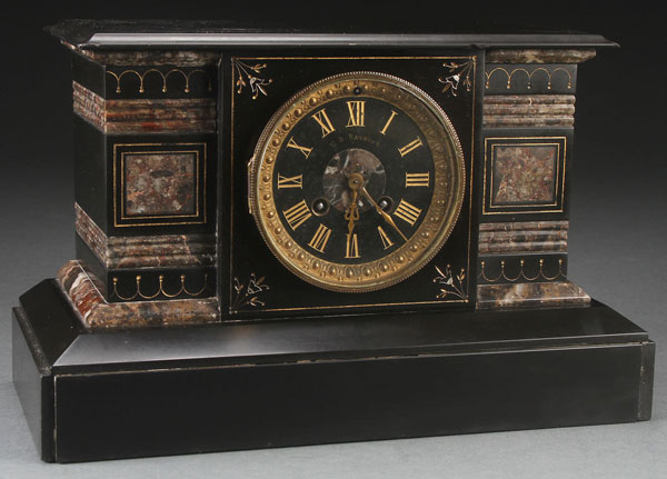 A FRENCH NAPOLEON III BLACK SLATE AND MARBLE MANTLE CLOCK. The black slate dial with gilt numerals inscribed "C.S. Raymond." Length 13.75 inches (35 cm).