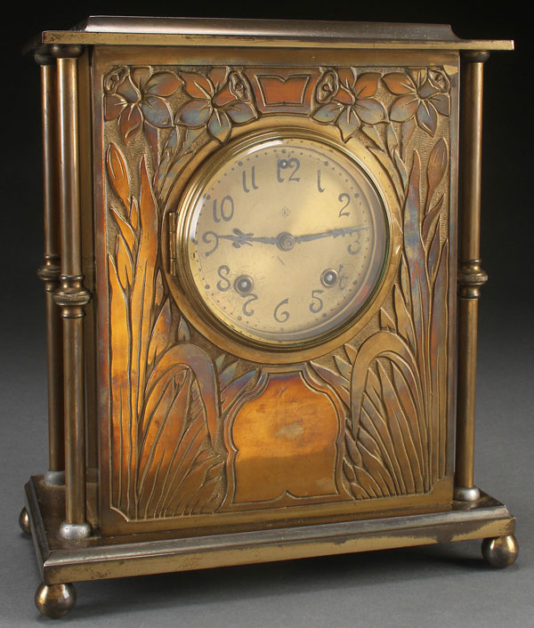 A VERY FINE ANSONIA ARTS AND CRAFTS BRONZE SHELF CLOCK, CIRCA 1900. With embossed stylized florals flanking turned columns. Height 12.25 inches (31 cm).