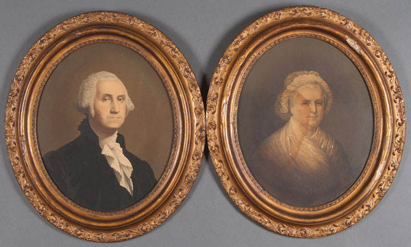 A PAIR OF ORIGINAL MIDDLETON STROBRIDGE PRINTED "OIL PORTRAITS" OF GEORGE AND MARTHA WASHINGTON. In their original glazed oval frames. Size including frame 22 x 18.5 inches each.