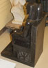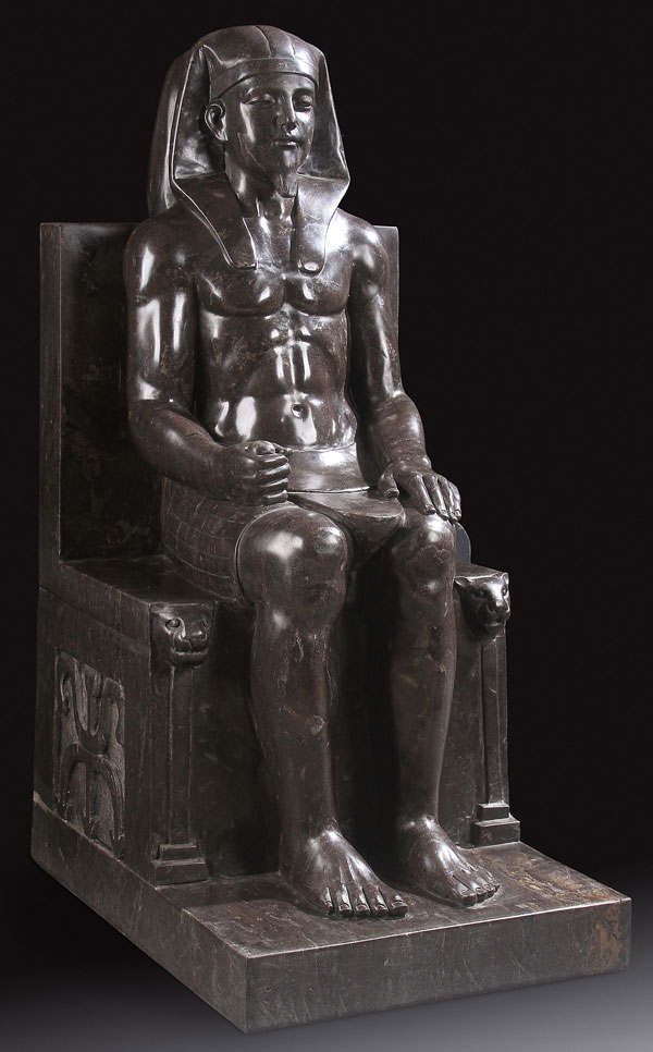 AN EGYPTIAN REVIVAL CARVED MARBLE FIGURE OF A SEATED PHARAOH, PROBABLY LAST QUARTER OF THE 20TH CENTURY. Depicted seated on throne in a dark charcoal and light gray color marble. Height 35.5 inches (90 cm).