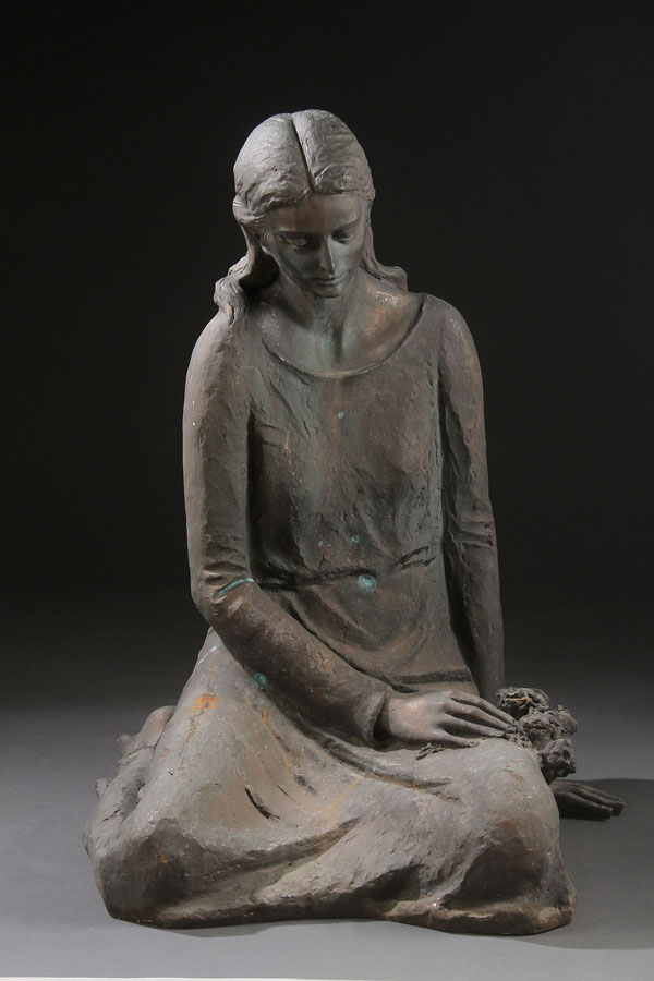 A LIFE-SIZE BRONZE GARDEN FIGURE, EARLY 20TH CENTURY. Depicting a kneeling woman with floral bouquet, most likely of the Virgin Mary. Height 37 inches (94 cm).