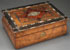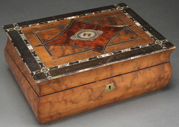 A CONTINENTAL INLAID AND BURLWOOD LAP DESK, MID 19TH CENTURY. The rectangular form with bombay shaped sides below a hinged lid, inlaid with ebony, Mother of Pearl, and various burlwoods, accented with silver wire. Length 13 inches (33 cm).