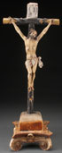 A SPANISH CARVED AND POLYCHROME CRUCIFIXION, 19TH CENTURY. The corpus finely carved in full round, of good anatomy and proportions. The head set with glass eyes and mounted on a carved and polychrome cross with sign and set into later composite base. Height 27 inches (68 cm).