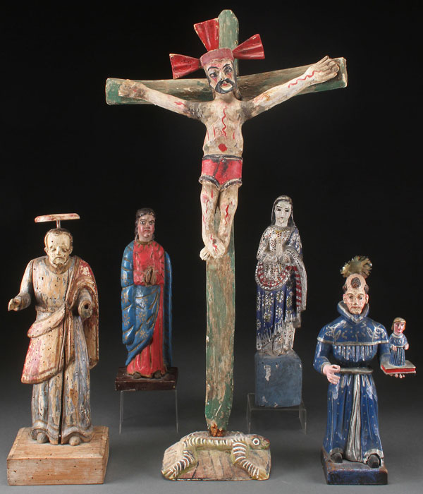 A GROUP OF FOUR CARVED AND POLYCHROMED SANTOS AND A CRUCIFIX, VARIOUS CULTURES, SUBJECTS, AGES, AND STATES OF CONDITION, PROBABLY 19TH AND 20TH CENTURY. Greatest height 38 inches (96.5 cm) – the crucifix.