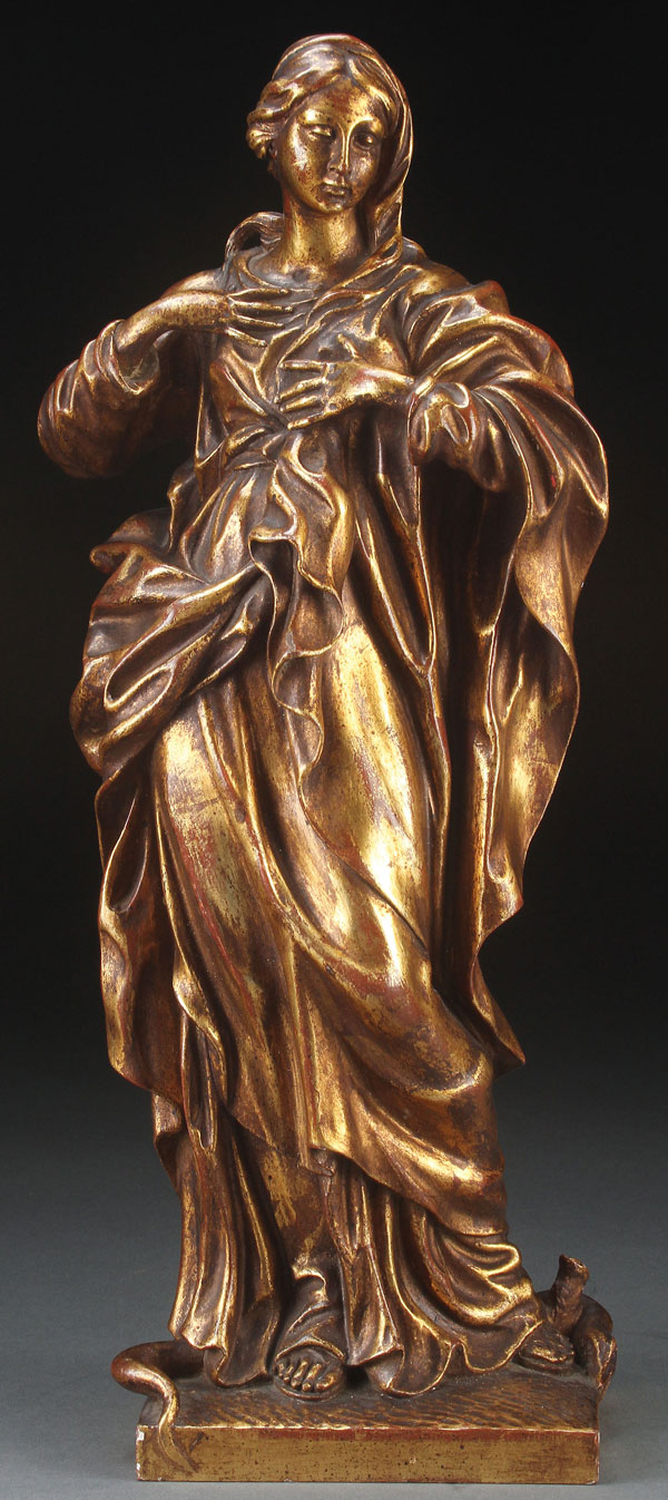 A CARVED AND GILT WOOD FIGURE OF THE VIRGIN, ITALIAN, 19TH CENTURY? Finely carved in full round, of good proportion and anatomy with deeply carved folds and flowing robes. The Virgin standing upright atop a serpent beneath her feet. Height 17.75 inches (45 cm).