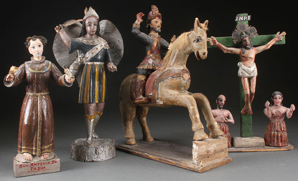 THREE CARVED AND POLYCHROME WOOD SANTOS AND A CRUCIFIXION AND PURGATORY GROUPING, VARIOUS CULTURES, SUBJECTS, AGES, AND STATES OF CONDITION. Greatest height 20 inches (51 cm).