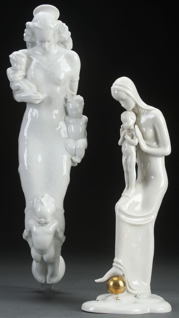 A PAIR OF GERMAN WHITE GLAZED PORCELAIN FIGURES OF THE VIRGIN. Comprising a large figure of the Virgin with three children by Rosenthal, finely modeled in full round and incised with the designer's name Hauenstein with integral hanging device and Rosenthal green mark and impressed model #1851. Length 16 inches (41 cm). Together with a very fine Metzler & Ortloff Art Deco Madonna and Child figure with gilt highlights and red factory mark under crown. Height 12.5 inches (31.7 cm).