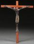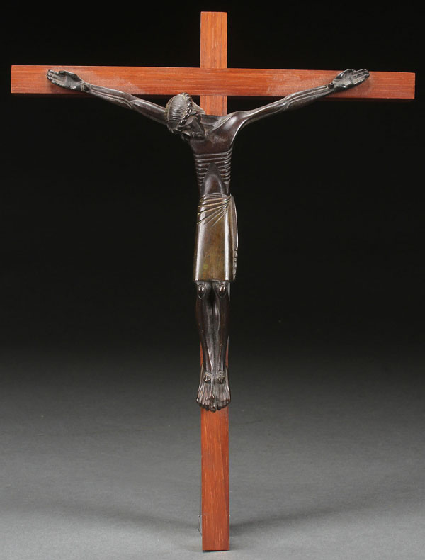 A JEAN LAMBERT-RUCKI (FRENCH 1888-1966) PATINATED BRONZE CORPUS CHRISTI MOUNTED ON ORIGINAL POLISHED WOOD CROSS. On verso label "Adalo. Paris, France." Length of corpus 8.5 inches (21.5 cm). Overall length including cross 13.1 inches (33.4 cm).