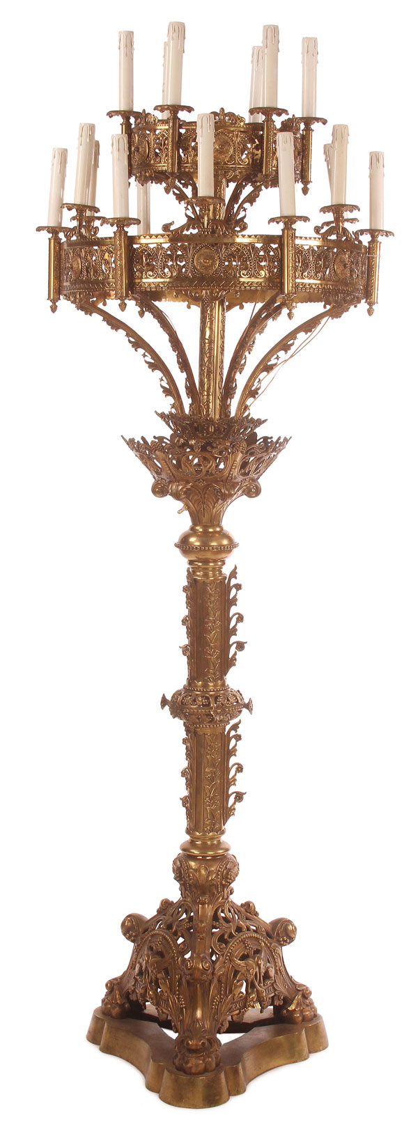 A LARGE AND IMPRESSIVE GILT BRONZE 17-LIGHT CANDELABRA, 19TH CENTURY. Resting on a scalloped trefoil base, supported by three acanthus form feet with chased decoration beneath pierced arched openwork sides displaying intertwined winged griffins beneath a squashed spherical capital from which rises the column with openwork scroll decorated central node and decorated with scrolling vines and floral head elements, beneath a large openwork grape and wheat motif double drip pan, supporting six arched brackets holding the large pierced circular collar upon which is mounted 12 candles beneath a similar pierced collar holding five candles. Later electrified. Height 73.5 inches (186.8 cm).