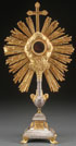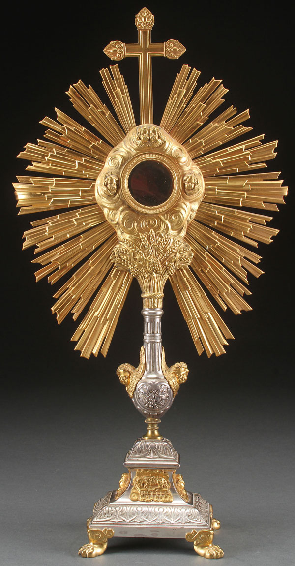 A FRENCH SILVERED AND GILT BRONZE MONSTRANCE, 19TH CENTURY. The base set on raised pall feet and with winged cherub heads and the Agnus Dei Lamb of God, beneath a fluted central support column also set with gilt bronze winged cherub heads from which springs forth a shock of wheat and grapes beneath the sunburst central exposition window surrounded by clouds and winged cherubs beneath a cross finial. Sans luna. Height 22.1 inches (56.5 cm).