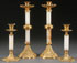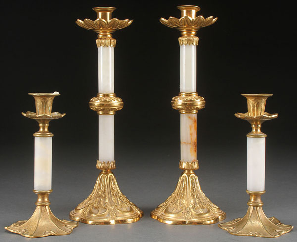 TWO PAIRS OF MATCHING GILT BRONZE AND ONYX ALTER CANDLESTICKS, CIRCA 1910. Greatest height 13 inches (33 cm).