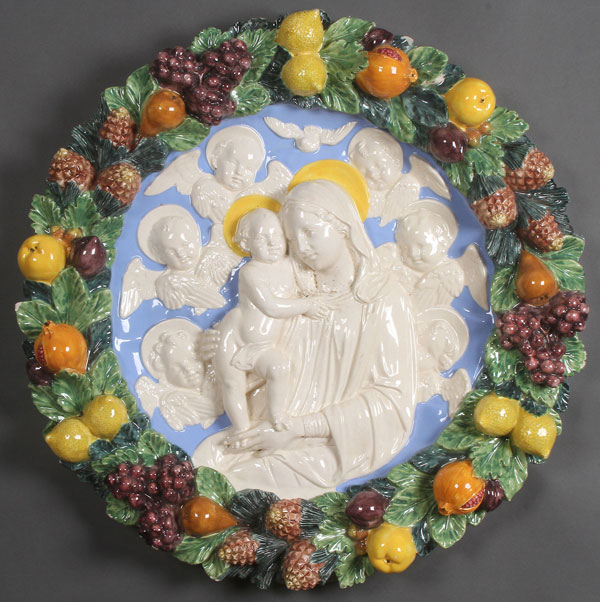 A LARGE DELLA ROBBIA STYLE GLAZED TERRACOTTA TONDO, ITALIAN. Depicting the Madonna and Child surrounded by winged cherubs with the Holy Spirit above them, on a blue field within a raised border of various fruits including pomegranates, pears, grapes, pine cones and others. Verso with retailer's label of G. Pasquinucci, Firenze. Diameter 27 inches (68.5 cm).