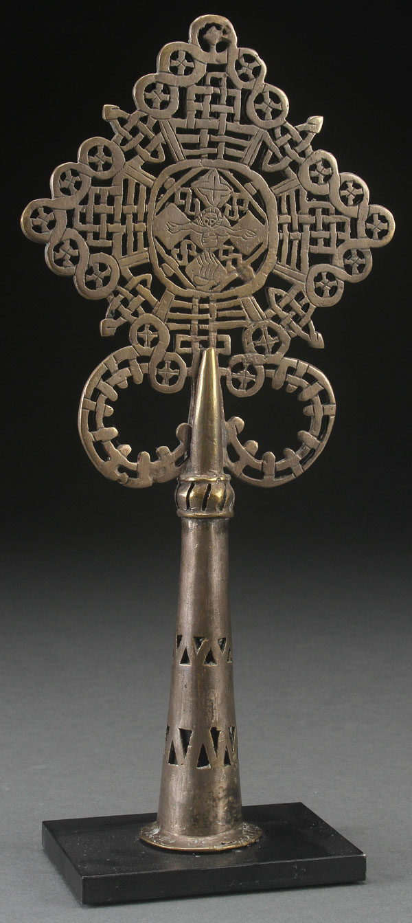 A SILVERED BRONZE COPTIC PROCESSIONAL CROSS, PROBABLY 19TH CENTURY. Height 11.5 inches (29 cm).