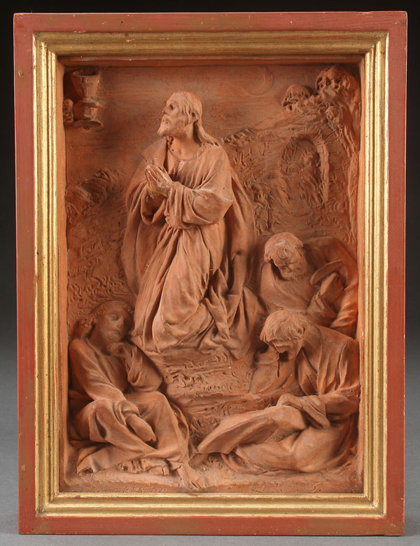 A GERMAN TERRACOTTA SCULPTED RELIEF PLAQUE OF CHRIST IN THE GARDEN OF GETHSEMANE. Artist signed "Baumestr" and dated 1916. 11 inches x 8.5 inches (28 x 21 cm).