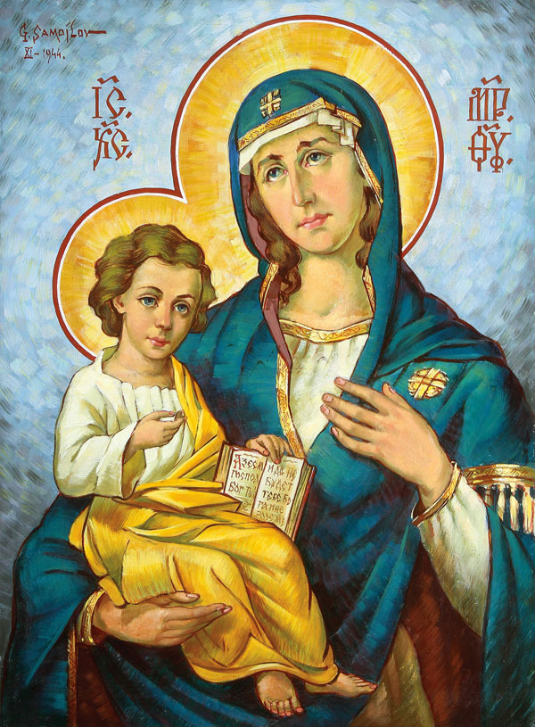 Born in 1904 in Chekhov, Russia, Grigorije Ivanovic Samojlov was one of 40,000 Russians who immigrated to the former Yugoslavia following the Revolution. For over six decades, Samojlov made a name for himself in Belgrade as an architect, professor, author, and painter. Perhaps one of his most notable works as an architect and painter was the creation of the iconostasis now adorning the Church of the Nativity of St. John the Baptist in Belgrade’s Central Cemetery. Samojlov carved the iconostasis while detained in Stalag (Stammlager) IX-C, a German prisoner of war camp, in 1943-1944 using scraps of steel, horse shoes and the oak sills of an old railway line. During that time, Samojlov also painted the now characteristic icons ornamenting the iconostasis, which are identical in style, color and palette to the offered painting.