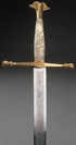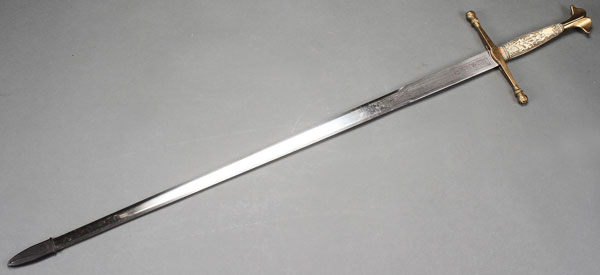 A LARGE AND IMPRESSIVE SWORD TOLEDO, SPAIN, SECOND HALF OF THE 20TH CENTURY IN THE 15TH CENTURY STYLE. The double edged blade etched, the cross guard with figural heads on terminating ends and with faux ivory handle set with enameled heraldic shield. Length 40 inches (101 cm).