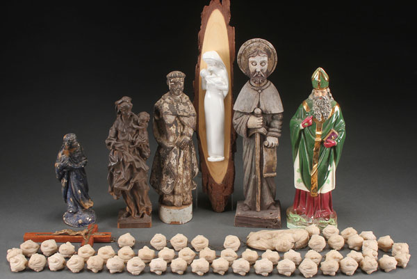 A GROUP OF SEVEN CATHOLIC RELIGIOUS ARTIFACTS, CIRCA 1850-1950. Including two carved wood Santos, a carved wood figure of the Madonna and Child, a porcelain figure of St. Patrick, a mounted image of the Virgin and Child, a large rosary, and a polychrome plaster statue of a Wise Man. Greatest height 17.5 inches.