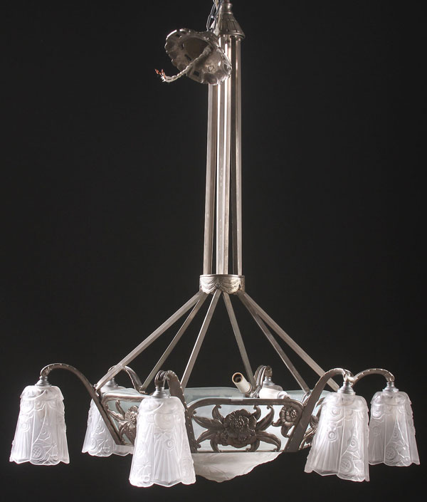 A FRENCH ART DECO AND ALUMINIUM ETCHED GLASS CHANDELIER, CIRCA 1930'S. With six satellite pendant shades. Signed "Robert."