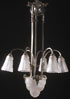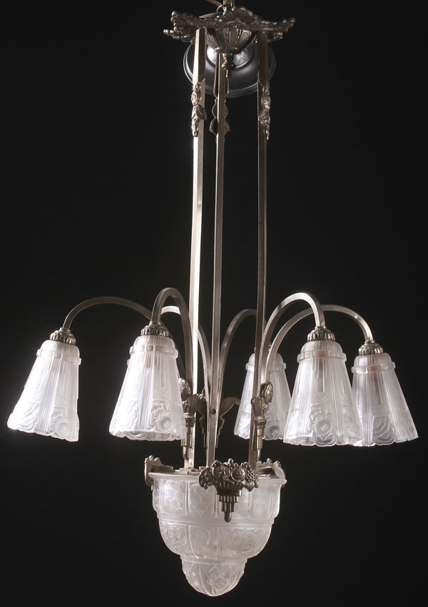 A FINE FRENCH ART DECO FROSTED AND MOLDED GLASS CHANDELIER, CIRCA 1925. With central inverted dome shade and stylized florals below six arched pendant lights suspended from a nickel plate framework with floral embossed ceiling plate. Apparently unmarked. Length 33.5 inches (85 cm).