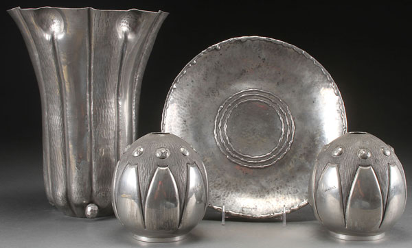 AN R. DELAVAN FRENCH ART DECO PEWTER GROUP, CIRCA 1925. Comprising a pair of matching Rene Delevan stylized vases, and handcrafted coupe diameter 11.75 inches (29.5 cm), each inscribed "R. Delavan" and with studio back stamps.