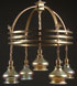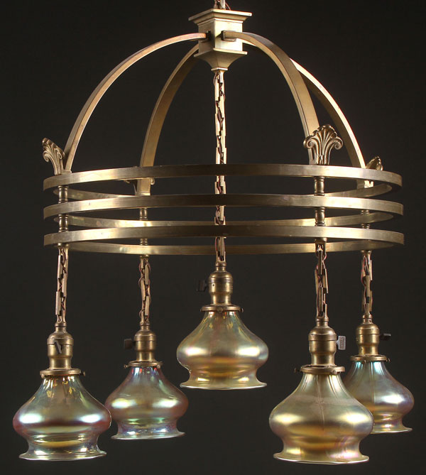 AN ARTS AND CRAFTS STYLE FIVE LIGHT BRONZE CHANDELIER, CIRCA 1910 WITH LATER ELEMENTS. Suspending six gold iridized shades in the manner of Steuben. Diameter 22 inches (56 cm). Height as illustrated 27 inches (68.5 cm).
