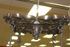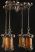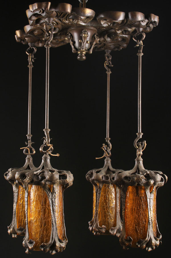 AN ART NOUVEAU BRONZE AND AMBER GLASS CHANDELIER, POSSIBLY AUSTRIAN, CIRCA 1900. The stylized four leaf cornered ceiling mount suspending four pendant shades with textured amber glass cylinders held with stylized floral bronze mounts, in a natural bronze with parcel gilt. Length 28 inches (71 cm), width 21 inches (53.5 cm).