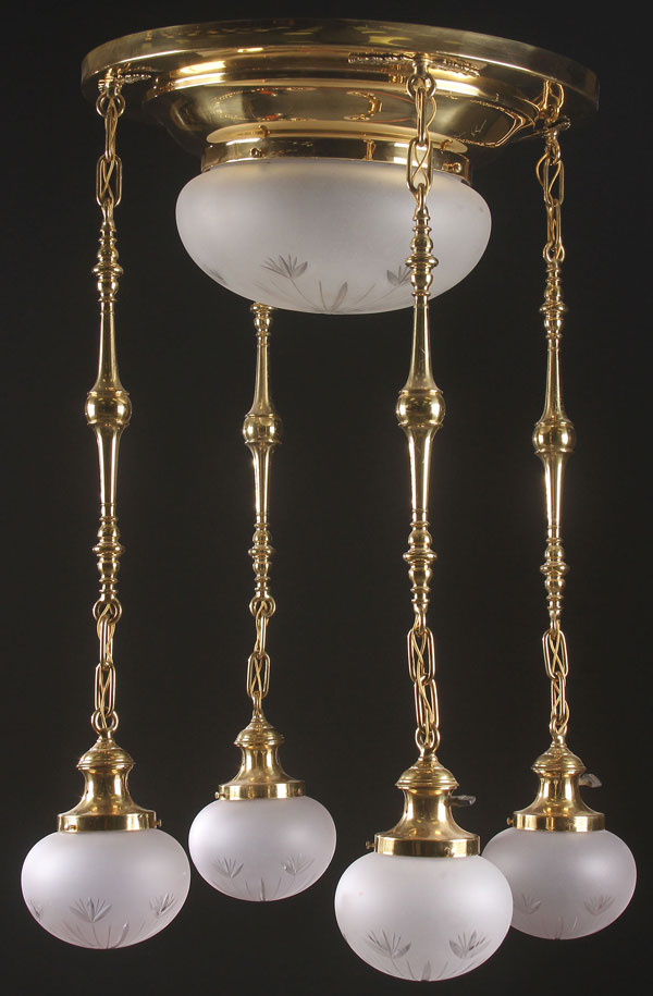 A VERY FINE AMERICAN BRASS CEILING PENDANT LIGHT, CIRCA 1900. The brass circular fixture with inverted mushroom shape shade, and suspending four matching frosted glass satellite fixtures, each with floral engraved designs, professionally refinished and rewired. Length 32 inches (81 cm), diameter 20 inches (51 cm).