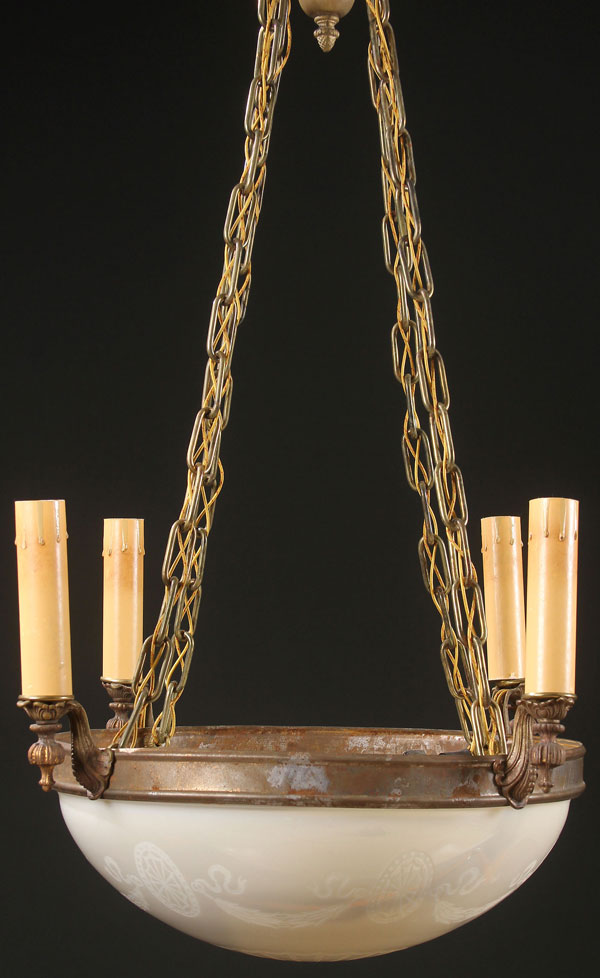 A STEUBEN ACID CUTBACK CALCITE GLASS HANGING CHANDELIER, EARLY 20TH CENTURY. In metal frame supporting four faux candle fixtures. Diameter 16 inches (40.5 cm), height as illustrated 29.5 inches (75 cm).
