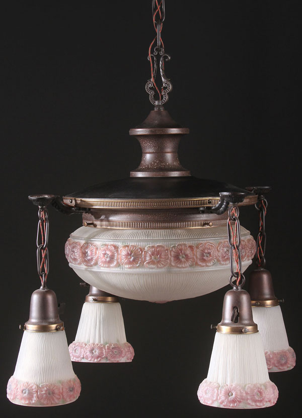A CONSOLODATED ART GLASS HANGING CHANDELIER, EARLY 20TH CENTURY. The embossed and satin finished inverted mushroom shape shade with polychrome floral band suspending four matching satellite shades. Shade diameter 13 inches (33 cm), length as illustrated approximately 25 inches (63.5 cm).
