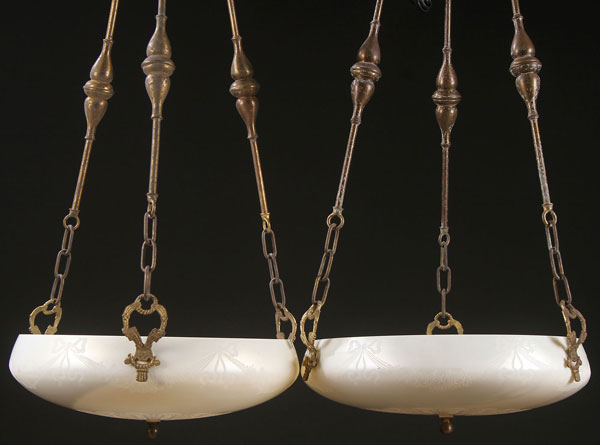 A PAIR OF STEUBEN ACID CUTBACK CALCITE HANGING LAMPS, EARLY 20TH CENTURY. Diameter 15.75 inches (40 cm).