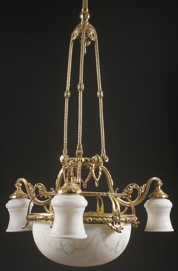A VERY FINE VICTORIAN HANGING CHANDELIER, CIRCA 1900. The polychrome white opaque shade suspended from an ornate floral embossed fixture with three scrolled arms. Diameter of shade 14.5 inches (37 cm), overall width, 24 inches (61 cm), height as illustrated 33 inches (84 cm).
