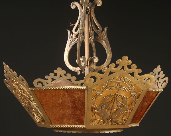 A GOTHIC REVIVAL GILT BRONZE AND CARAMEL SLAG GLASS HANGING LAMP, EARLY 20TH CENTURY. With four reticulated panels depicting winged griffins. Width 28 inches (71 cm), height as illustrated 23 inches (58.5 cm).