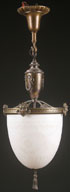 A STEUBEN ACID CUTBACK PENDANT LIGHT, EARLY 20TH CENTURY. Suspended from a bronze frame mounted with grotesque facial masks. Diameter 13 inches (33 cm), length as illustrated 31 inches (79 cm).