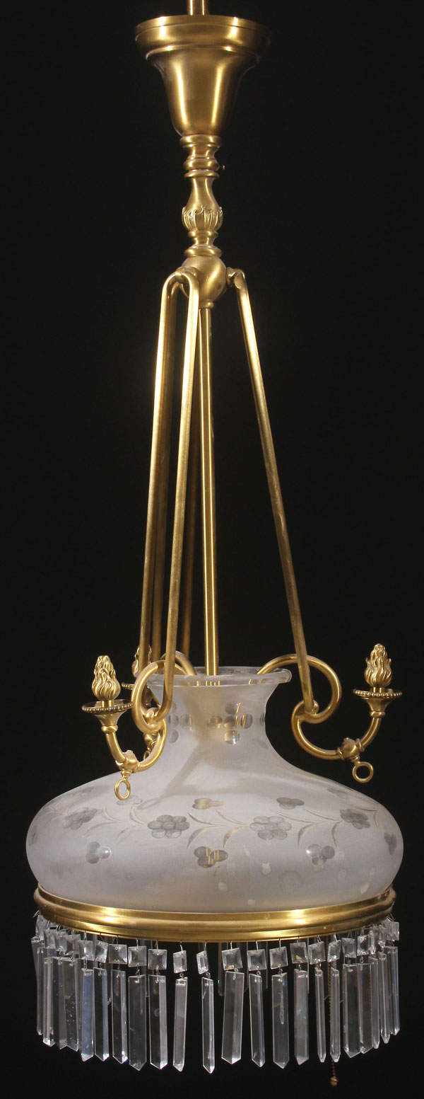 AN ELEGANT GILT BRONZE AND ETCHED GLASS HANGING LAMP. A contemporary reproduction of an early 19th century American Empire fixture, with cut prism pendants. Diameter 16 inches (41 cm), length 46 inches (117 cm).