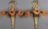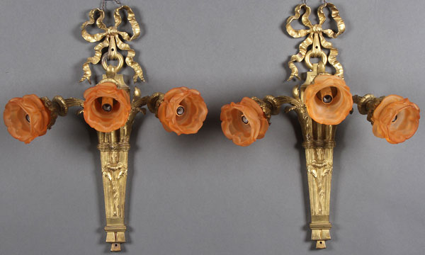 A PAIR OF FRENCH LOUIS THE XV STYLE GILT BRONZE WALL SCONCES, EARLY 20TH CENTURY. With three scrolled acanthus leaf arms terminating with amber floral form glass shades. Length 21 inches (53.3 cm).