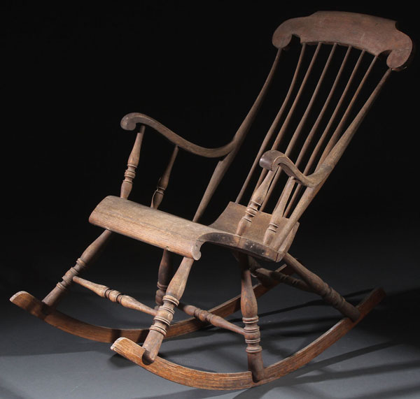 A SWEDISH OAK GUNGSTOL (ROCKER), FIRST HALF 19TH CENTURY. With spindle back and six turned legs. Finish removed, height 43 inches (109 cm).